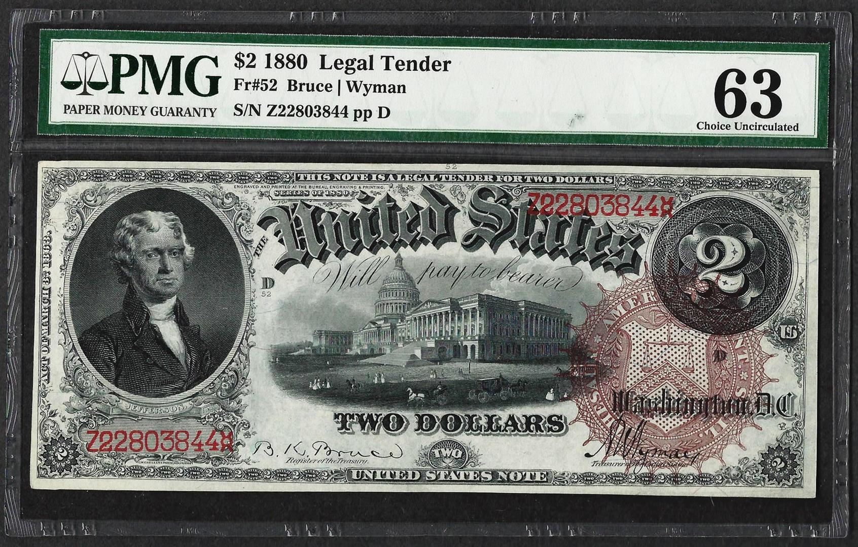 One 1880 $2 Legal Tender Note Fr.52 PMG Choice Uncirculated 63. PMG Certified.