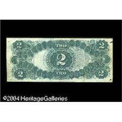 1880 $2 Legal Tender Note, Fr-52, VF. <B>Fr. 52 $2 1880 Legal Tender Fine.</B></I> We'd likely have categorized this as a Very Fine based on its overall degree of circulation, but there are a few scattered stains and a couple of larger than pinhole sized voids near the margins. <BR><BR><B>Important notice:</B> Heritage usually auctions material at the rate of 200-250 lots per hour. On some occasions eBay Live bid software or the Internet may not be able to keep up with the pace of the auction. We recommend placing a realistic absentee bid now as insurance to avoid disappointment. Occasionally the auctioneer may eliminate or reject an eBay Live bid, and the auctioneer may also reopen a lot after the close of the eBay live bidding (usually because we missed an audience bid), and may reject your bid even if it shows you as the winning bidder. By bidding via eBay Live, you agree that Heritage may award the lot to another bidder at its sole discretion under the circumstances described above or any other reasonable circumstances. Since eBay bids are not shown to us until we open the lot on the floor, we treat those bids just like floor bids. In most cases the floor responds before the eBay bid is presented to us, due to Internet lag time, so for consistency we have made it a policy that floor bids are always considered first over tie eBay live bids. Also please note that all Heritage lots purchased through eBay Live carry a 20% Buyer's Premium. Please make sure you read the Terms and Conditions before you bid. This lot is being auctioned in conjunction with a live floor auction by Heritage Galleries & Auctioneers. All final auction and invoice information will be supplied by Heritage Galleries & Auctioneers, and all other information should be considered preliminary. Lot:16822