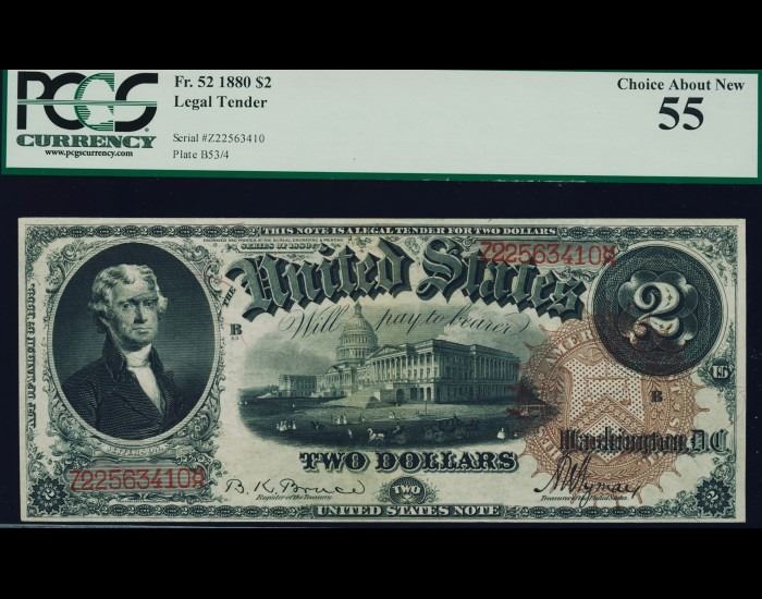 One 1880 $2 Legal Tender Note PCGS 55.
