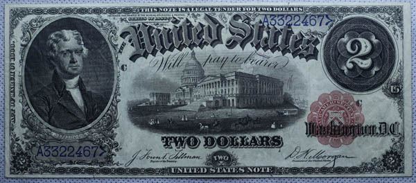 1880, 2 United States Note. S/N A3322467 pp C. Tillman / Morgan. Exceptional paper quality. PMG graded Very Fine 30 EPQ.