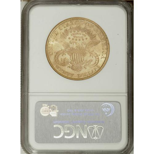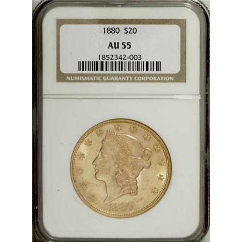 <B>1880 $20 AU55 NGC.</B></I> Modest highpoint wear has little impact on the eye appeal of this highly lustrous yellow-gold double eagle, one of just 51,456 pieces of its issue. The obverse is moderately abraded overall, while the reverse displays fewer marks.<BR><BR><b>Shipping:</b> Coin/Currency (<a target="_blank" href="http://www.heritageauctions.com/common/shipping.php">view shipping information</a>)