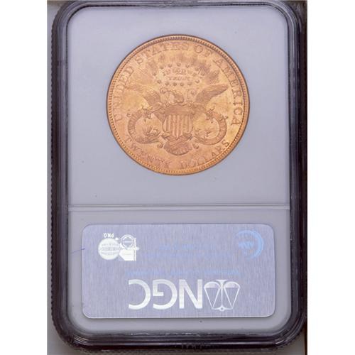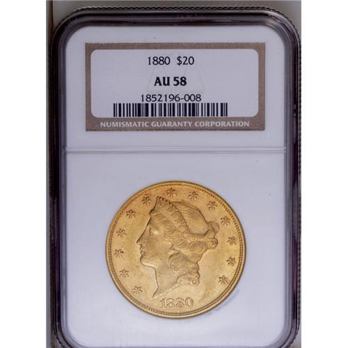 <B>1880<$20> AU58 NGC.</B></I> A scarce Type Three double eagle from the Philadelphia Mint, the 1880 was produced to the extent of just 51,456 coins. This is an originally preserved near-Mint specimen with red-gold highlights over straw-gold color. Well struck with scattered abrasions and a trace of highpoint wear on the obverse. Census: 89 in 58, 43 finer (7/06).
