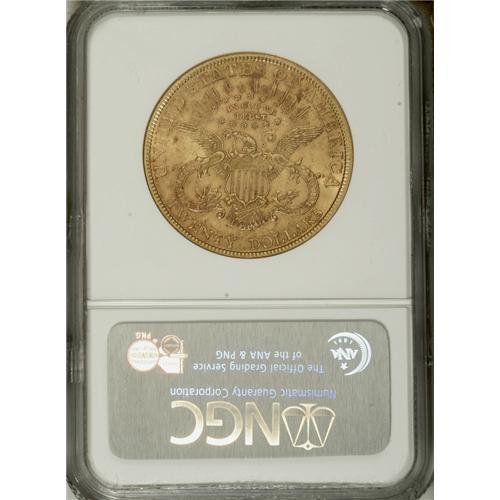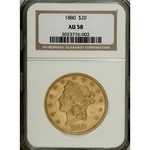 <B>1880 $20 AU58 NGC.</B></I> Liberty's cheek has a whisper of friction, but the mint luster is virtually complete, and there are no obtrusive marks. Although the Philadelphia Mint struck half eagles and eagles in vast quantities in 1880, the facility produced only 51,420 business strike twenties that year.<BR><BR><b>Shipping:</b> Coins & Currency (<a target="_blank" href="http://www.heritageauctions.com/common/shipping.php">view shipping information</a>)