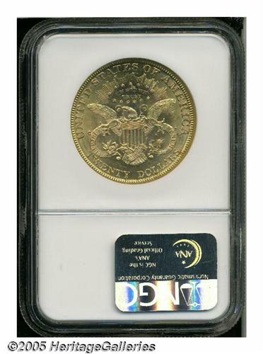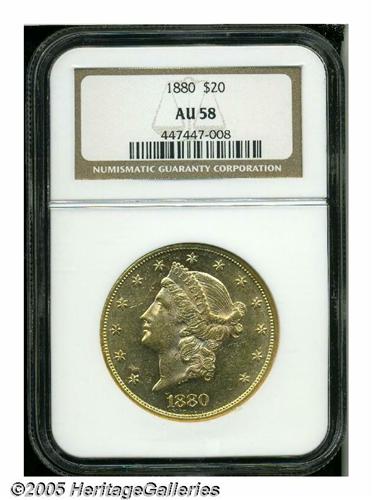 <B>1880<$20> AU58 NGC.</B></I> The majority of 1880 twenties grade VF or XF. They are very scarce in AU and rare in Uncirculated grades. This high-end AU example displays bright peach-gold surfaces with considerable remaining luster. The design elements are very well defined, enhancing the eye appeal of this attractive specimen. A few light contact marks are scattered about, particularly on Liberty's cheek and in the left (facing) obverse field. Population: 72 in 58, 38 finer (4/05).