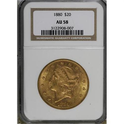 <B>1880 $20 AU58 NGC.</B></I> Well-defined with ample remaining luster in the orange-gold fields. The portrait shows only a hint of highpoint friction. An abrasion passes below Liberty's eye, and scattered alloy spots are noted on and around the eagle's shield on the reverse.<BR><BR><B>Coin Engraver:</B> James B. Longacre<BR><BR><b>Shipping:</b> Coins & Currency (<a target="_blank" href="http://www.heritageauctions.com/common/shipping.php">view shipping information</a>)
