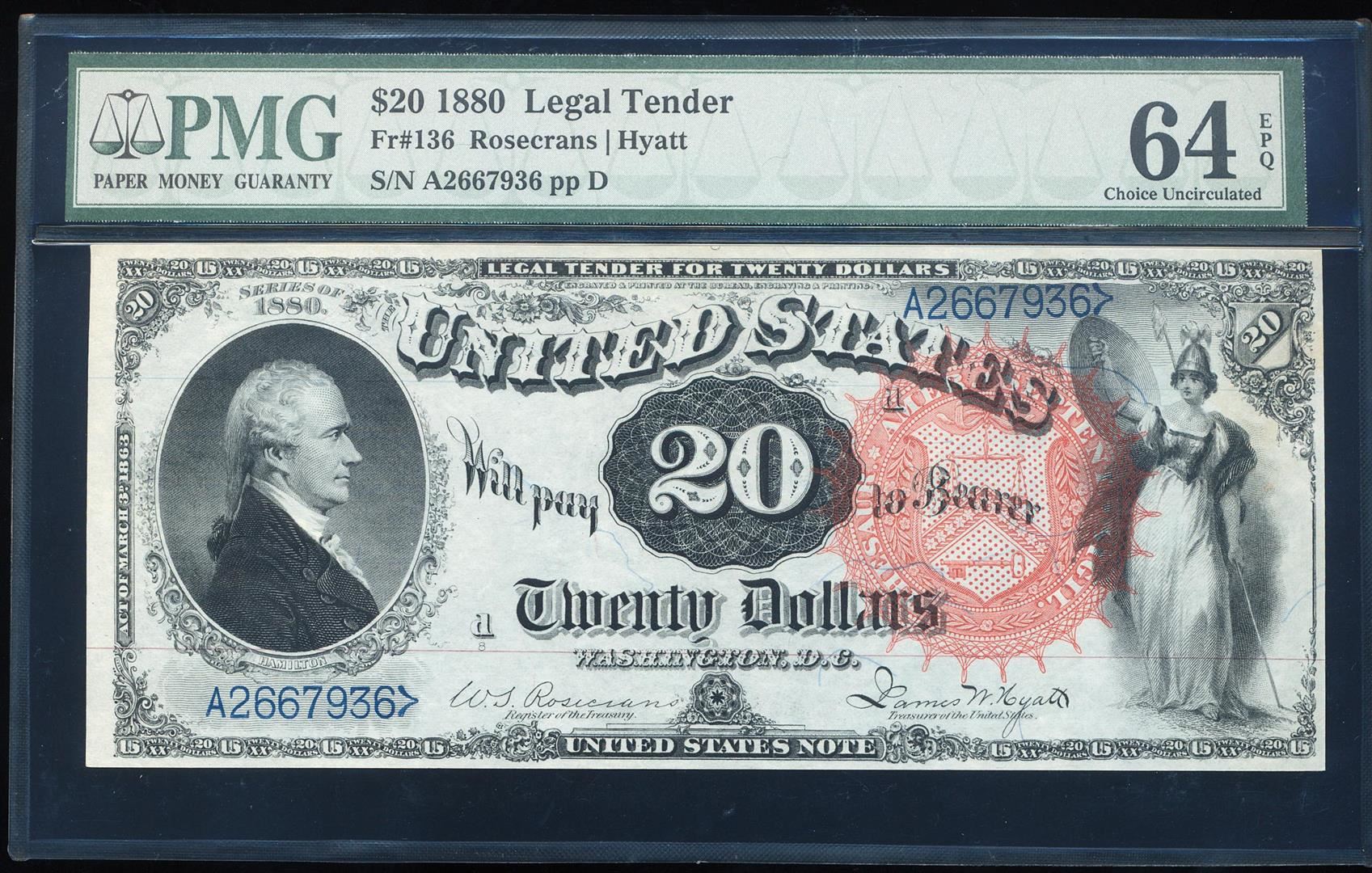 One 1880 $20 Legal Tender Note Fr.136 PMG Choice Uncirculated 64EPQ.