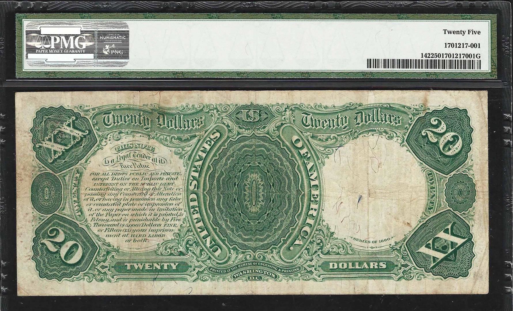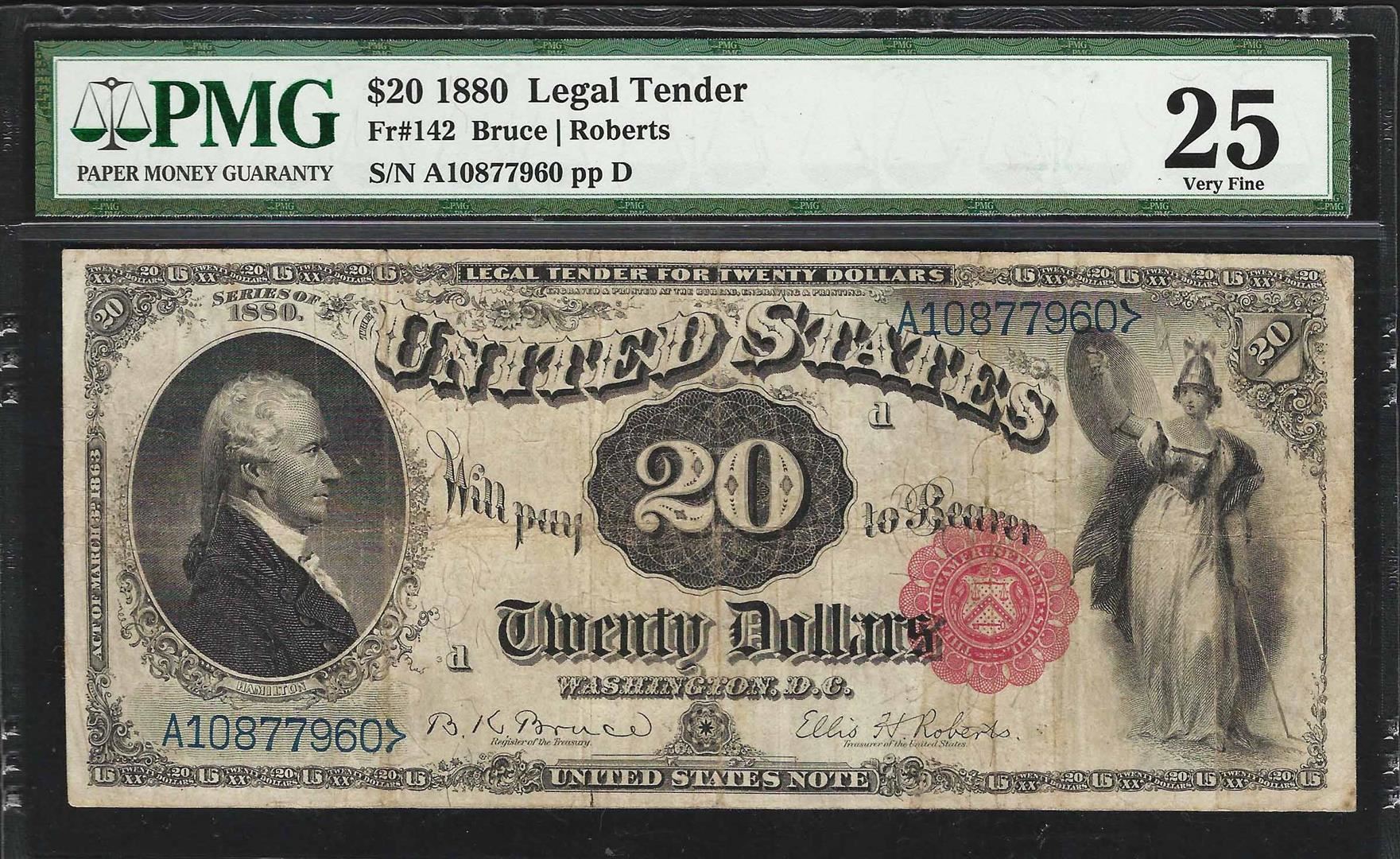 One 1880 $20 Legal Tender Note Fr.142 PMG Very Fine 25. PMG Certified.