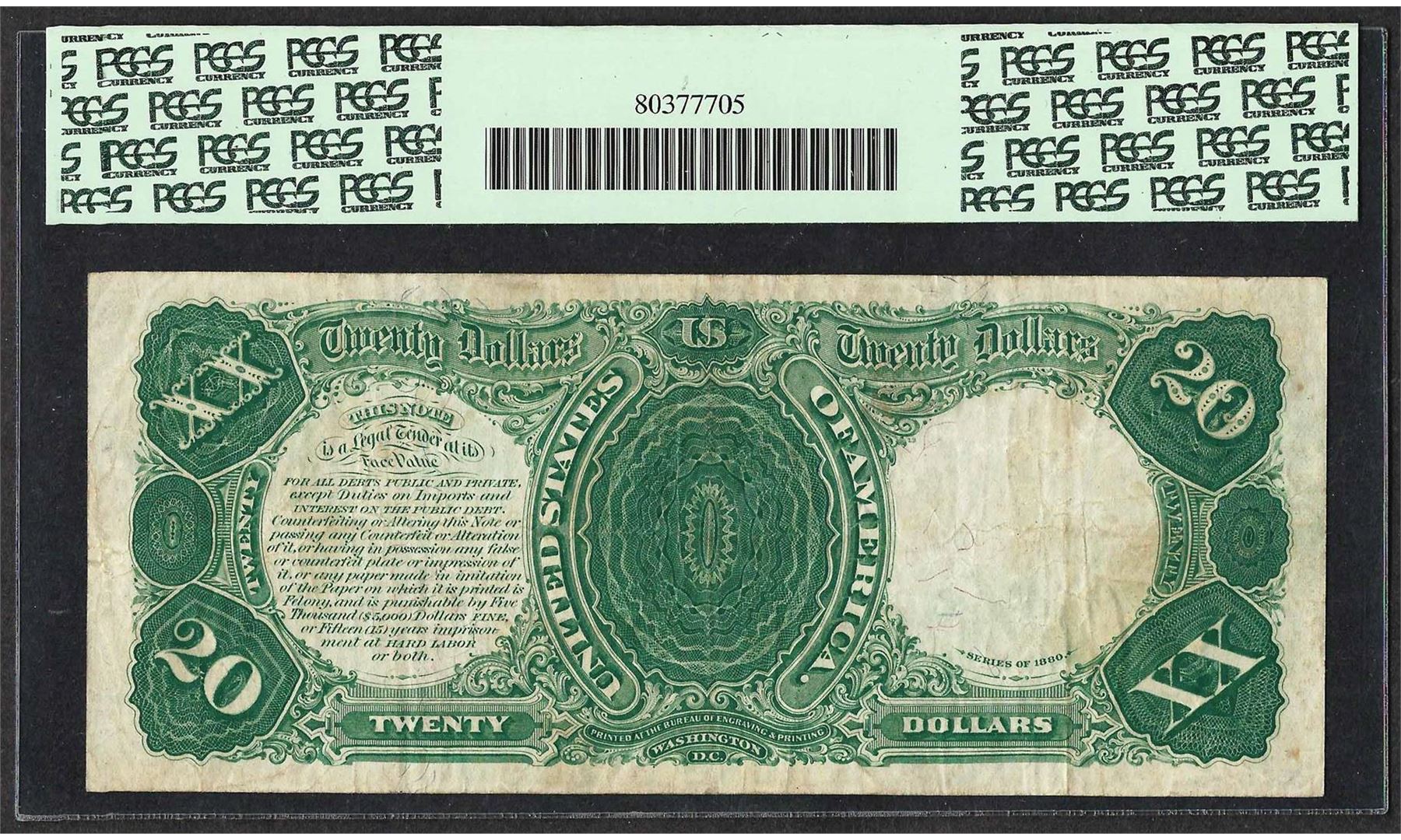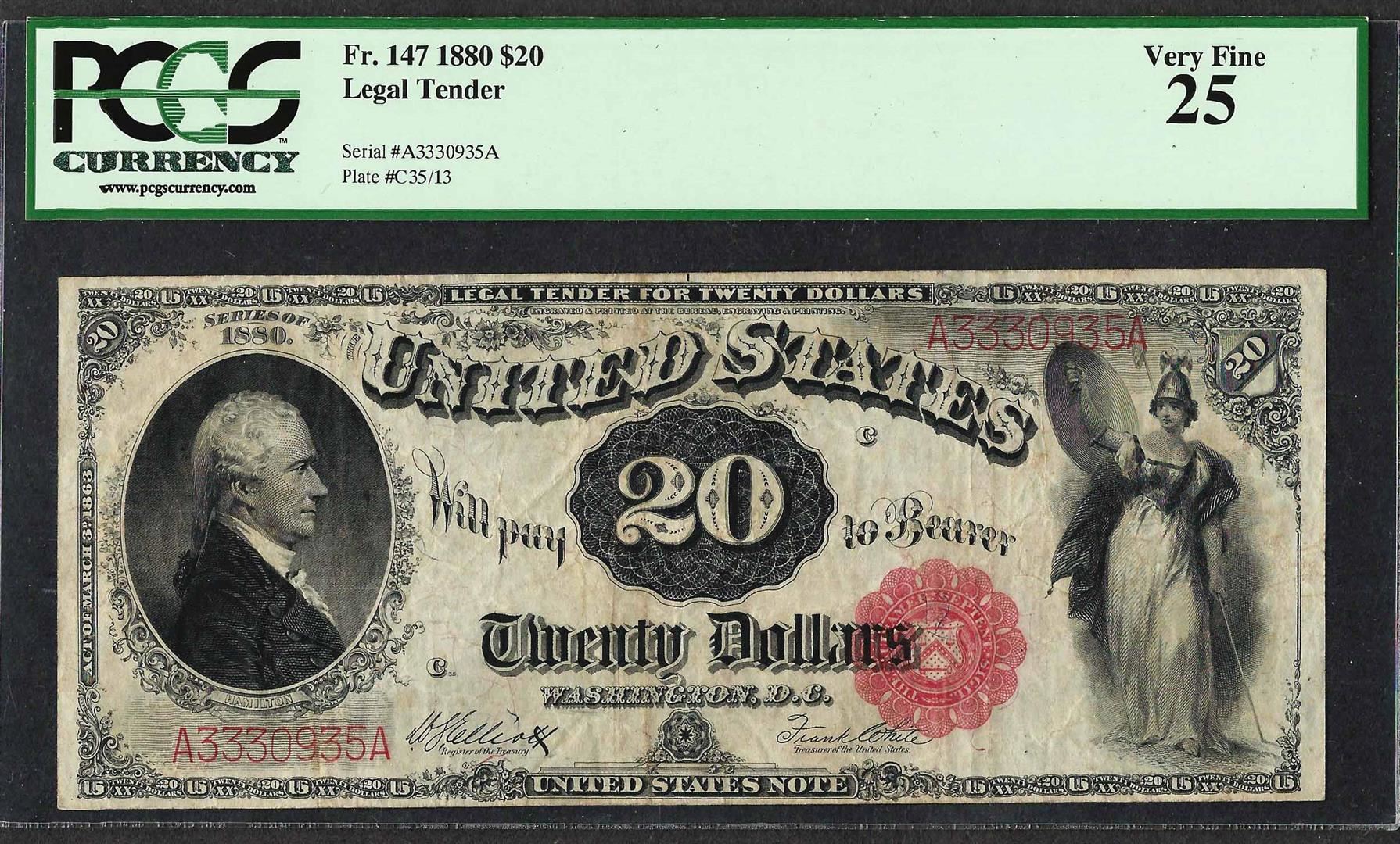 One 1880 $20 Legal Tender Note Fr.147 PCGS Very Fine 25. PCGS Graded.