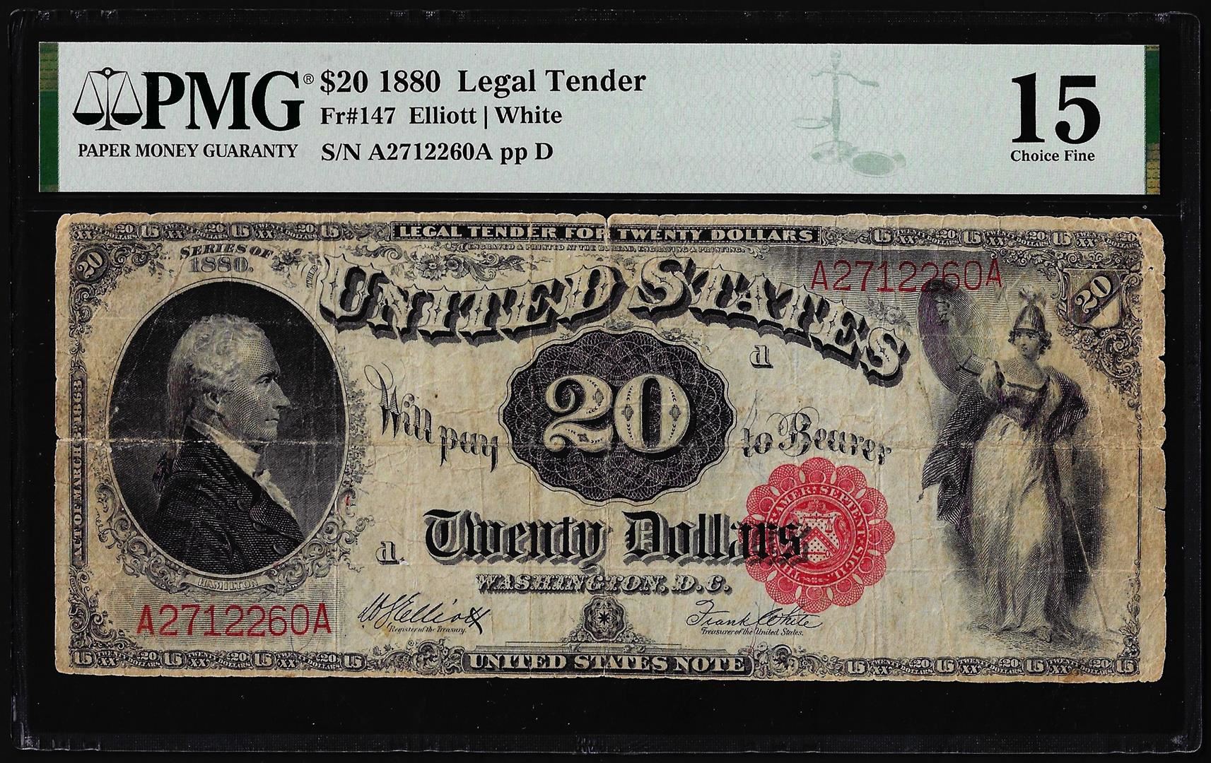 One 1880 $20 Legal Tender Note Fr.147 PMG Choice Fine 15. PMG Certified.