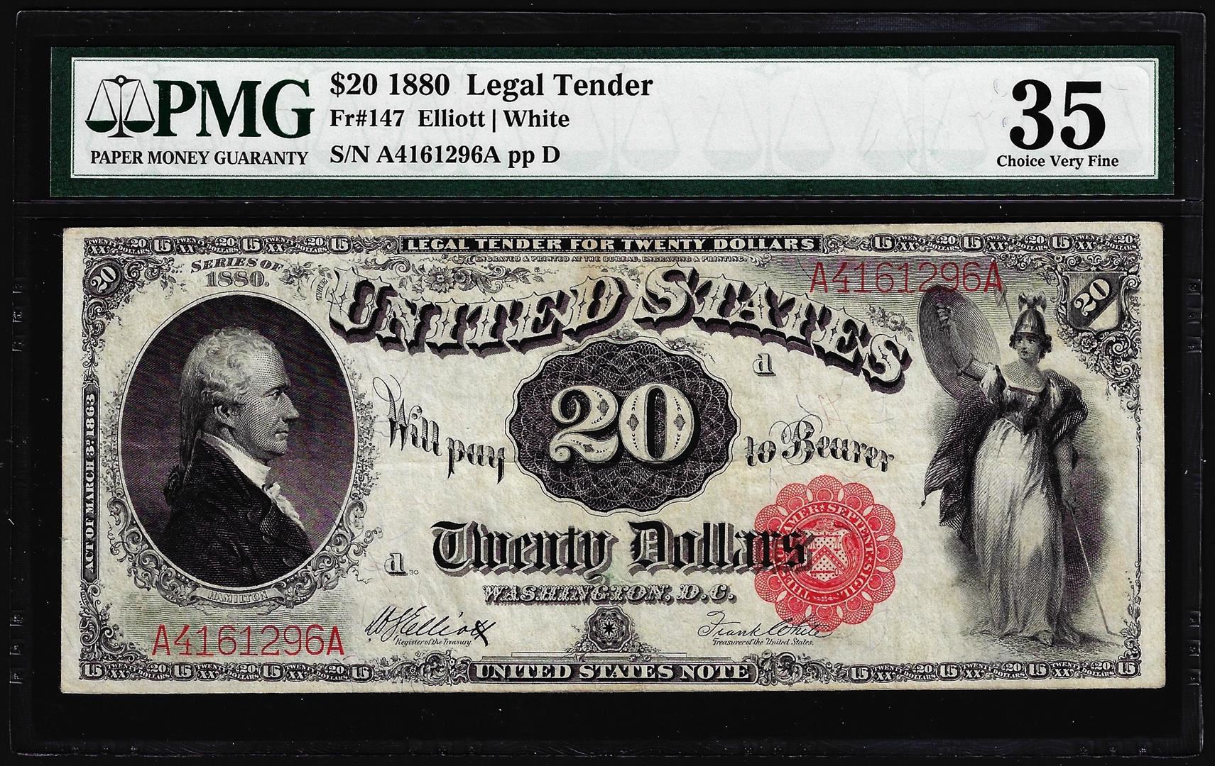 One 1880 $20 Legal Tender Note Fr.147 PMG Choice Very Fine 35. PMG Certified.