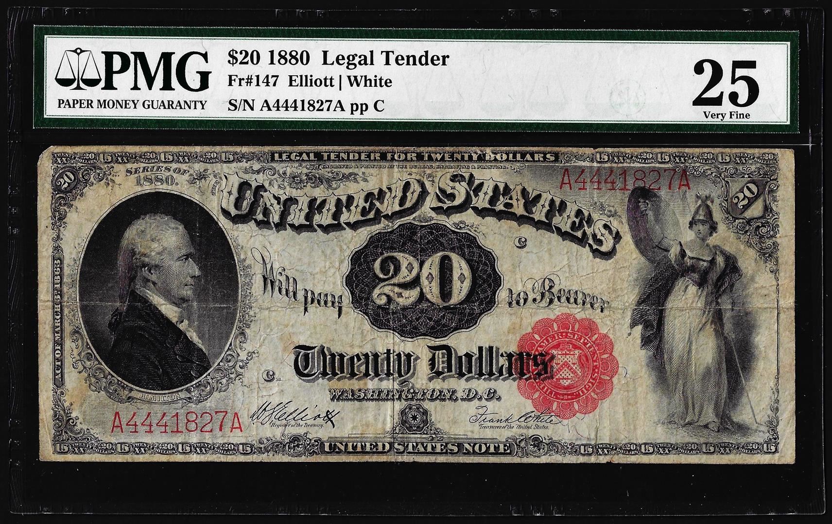 One 1880 $20 Legal Tender Note Fr.147 PMG Very Fine 25. PMG Certified.