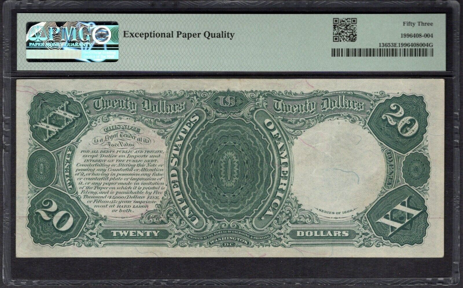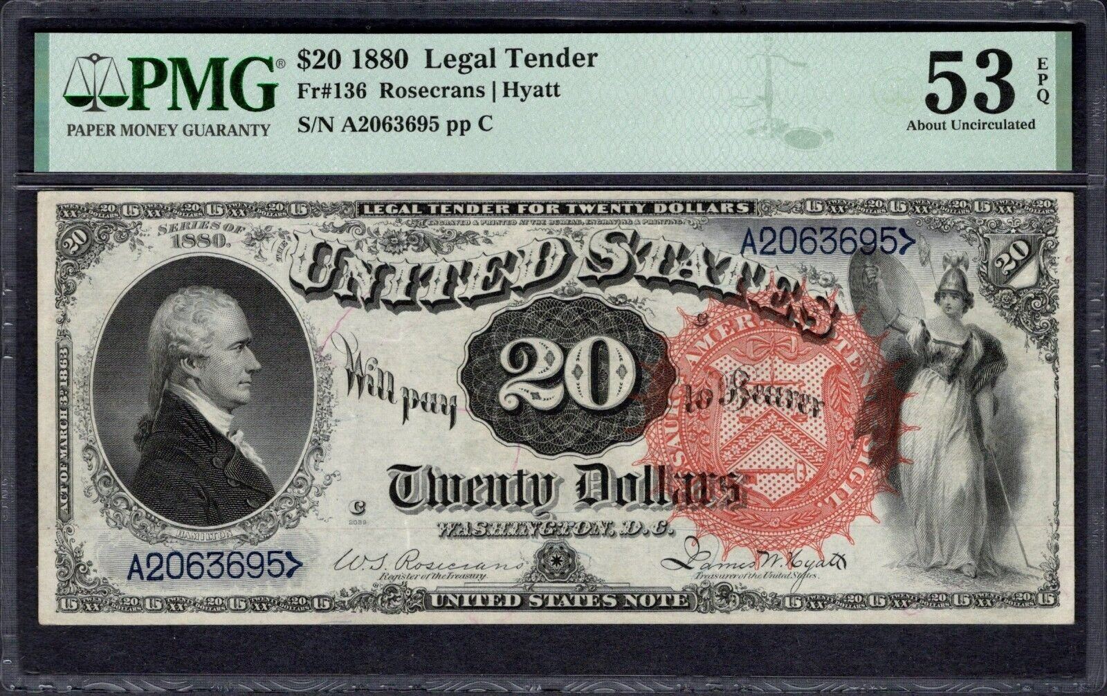 One 1880 $20 Legal Tender Note PMG 53EPQ.