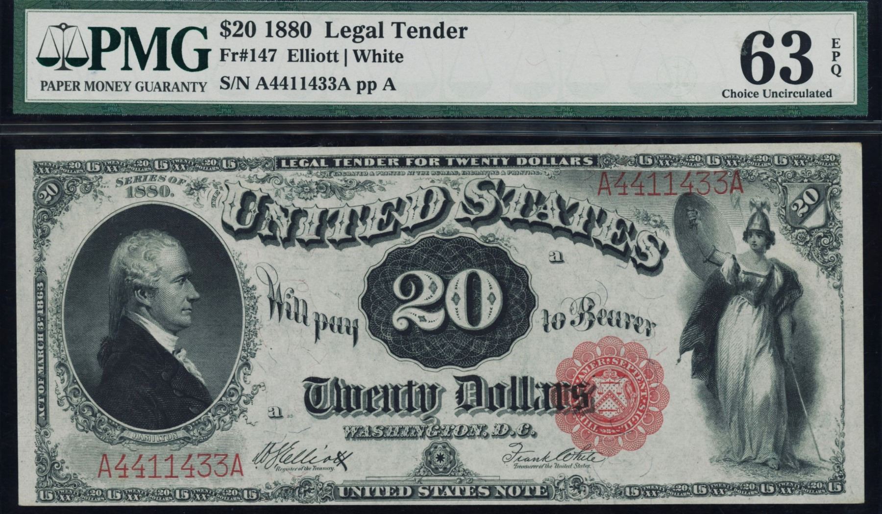 One 1880 $20 Legal Tender Note PMG 63EPQ.