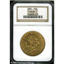 <B>1880 $20 MS60 NGC.</B></I> This is a low-mintage issue, with just 51,420 business strikes coined. Few have survived in Mint State grades. This example has apricot-gold color with splashes of dark toning. The surfaces are abraded but not excessively so. Population: 14 in 60, 24 finer (1/05). Lot:9159