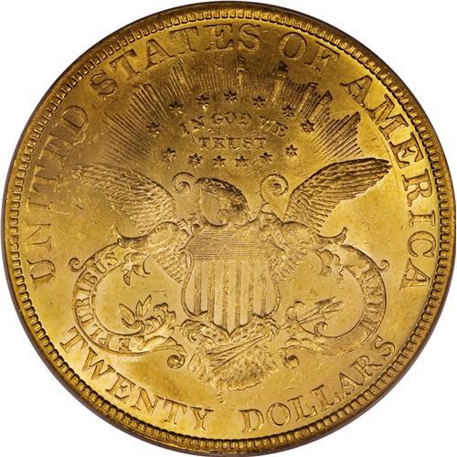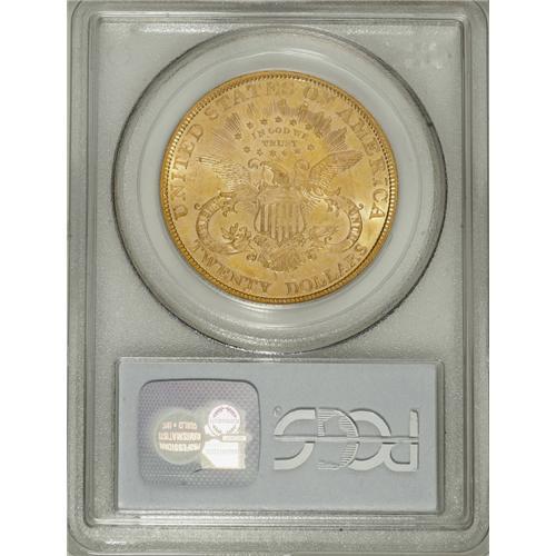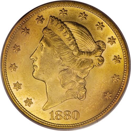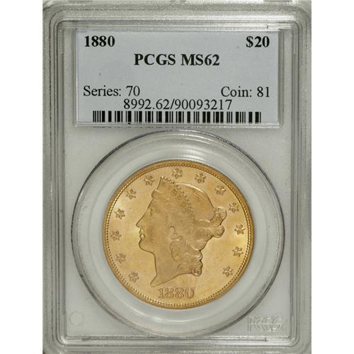 <B>1880 $20 MS62 PCGS.</B></I> After generous mintages numbering in the hundreds of thousands for the mid- to late 1870s, the P-mint double eagle production in 1880 plummeted to only 51,420 pieces, and examples in high grade are accordingly elusive. This lustrous peach-gold piece appears quite high-end for the grade, with excellent eye appeal, despite the presence of a few light, undistracting abrasions, mostly well away from the prime focal points. PCGS has certified only five pieces in this high grade, with three coins finer, while NGC has graded four MS62 examples, with four finer (4/07).<BR><BR><b>Shipping:</b> Coins & Currency (<a target="_blank" href="http://www.heritageauctions.com/common/shipping.php">view shipping information</a>)