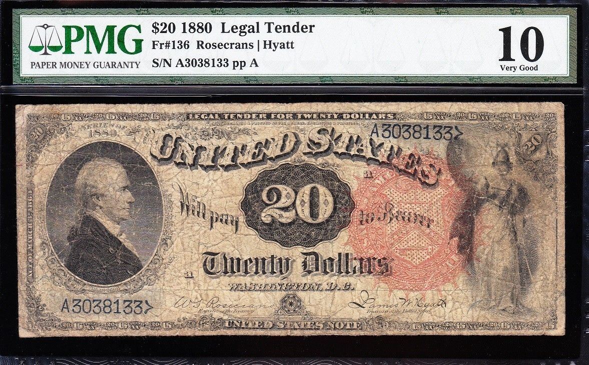 One 1880 $20 Pink Seal Legal Tender Note PMG 10.