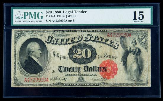 1880, $20 United States Note. PMG Choice Fine 15. . Fr-147. This is one of the more affordable and available Fr. numbers of this denomination in large size, making this example ideal for the beginning type collector.