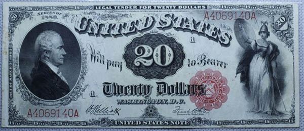 1880, 20 United States Note. S/N A4069140A pp D. Elliott / White. Minor stains. PMG graded Choice Very Fine 35.