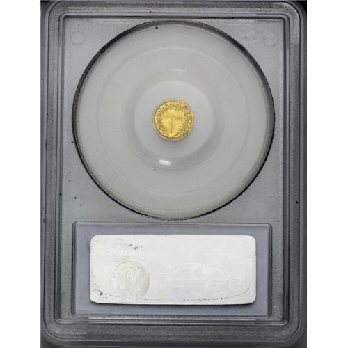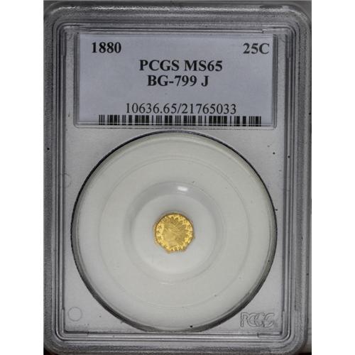 <B>1880<25C> Indian Octagonal 25 Cents, BG-799J, R.3, MS65 PCGS.</B></I> A well struck and prooflike apricot-gold Gem. The obverse is pristine, and the reverse has only a few faint slide marks which were likely on the planchet prior to the strike. Population: 35 in 65, 5 finer (3/06). <BR><BR><B>Important notice:</B> Heritage usually auctions material at the rate of 200-250 lots per hour. On some occasions eBay Live bid software or the Internet may not be able to keep up with the pace of the auction. We recommend placing a realistic absentee bid now as insurance to avoid disappointment. Occasionally the auctioneer may eliminate or reject an eBay Live bid, and the auctioneer may also reopen a lot after the close of the eBay live bidding (usually because we missed an audience bid), and may reject your bid even if it shows you as the winning bidder. By bidding via eBay Live, you agree that Heritage may award the lot to another bidder at its sole discretion under the circumstances described above or any other reasonable circumstances. Since eBay bids are not shown to us until we open the lot on the floor, we treat those bids just like floor bids. In most cases the floor responds before the eBay bid is presented to us, due to Internet lag time, so for consistency we have made it a policy that floor bids are always considered first over tie eBay live bids. Also please note that all Heritage lots purchased through eBay Live carry a 20% Buyer's Premium. Please make sure you read the Terms and Conditions before you bid. This lot is being auctioned in conjunction with a live floor auction by Heritage Galleries & Auctioneers. All final auction and invoice information will be supplied by Heritage Galleries & Auctioneers, and all other information should be considered preliminary. Lot:4791 <BR><BR><B>Winning Notification and Billing:</B> After the FINAL session in this auction is complete, Heritage will send e-mail and snail mail invoices. This process normally takes several days. All final auction and invoice information will be supplied by Heritage Galleries & Auctioneers, and all other information should be considered preliminary. <BR><BR>This auction will be conducted on a live auction floor and over the Internet through eBay Live. If you choose to place an absentee bid, please take a moment to <font color='#0000ff'><u><a href='http://pages.ebay.com/liveauctions/help/before/laabsentee.html'>learn how eBay Live absentee bidding works</a></u></font><font color='#000000'>