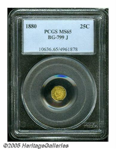 <B>1880<25C> Indian Octagonal 25 Cents, BG-799J, R.3, MS65 PCGS.</B></I> Radiant olive-gold color and nicely mirrored fields ensure the eye appeal of this boldly struck and attractive Gem. Not a rare variety, but difficult to locate any finer.