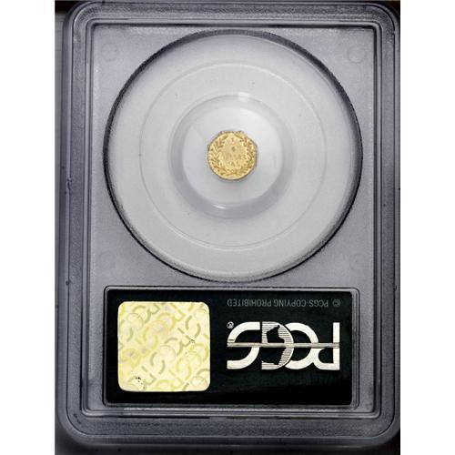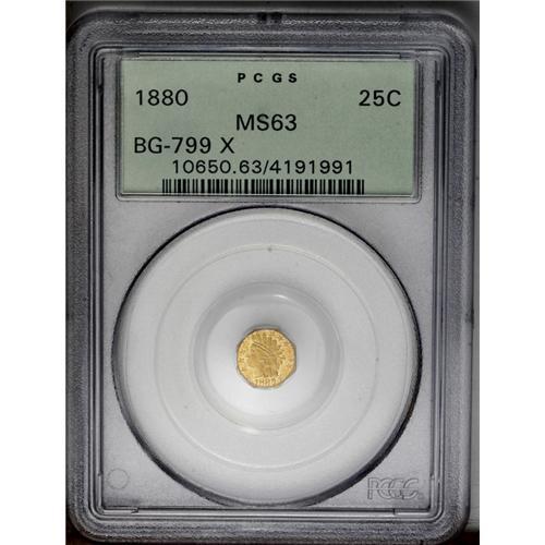 <B>1880<25C> Indian Octagonal 25 Cents, BG-799X, R.3, MS63 PCGS.</B></I> A charming green-gold example from the waning years of Period Two. The fields are more satiny than prooflike, as produced. Certified in a green label holder.