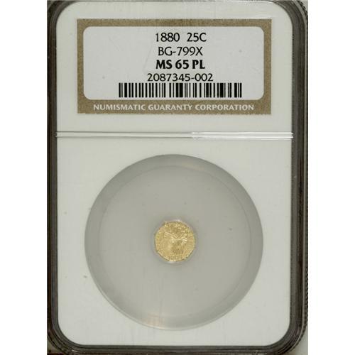 <B>1880 25C Indian Octagonal 25 Cents, BG-799X, R.3, MS65 Prooflike NGC.</B></I> The strike is unimprovable, and the flashy fields are essentially void of marks. A marvelous representative of the Period Two Indian octagonal quarter type. Census: 3 in 65 Prooflike, 1 finer (4/07).<BR><I>From The Diamond K Collection of California Fractional Gold.</B></I><BR><BR><b>Shipping:</b> Coins & Currency (<a target="_blank" href="http://www.heritageauctions.com/common/shipping.php">view shipping information</a>)