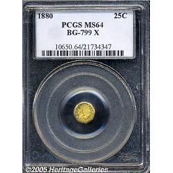 <B>1880 25C Indian Octagonal 25 Cents, BG-799X, R.3, MS64 PCGS.</B></I> A shimmering honey-gold piece. A faint slide mark beneath the lowest headdress feather does not appear to limit the grade. The stars are unusually large on this charming small denomination gold type, and combined with the large Indian Head motif, create a crowded design.