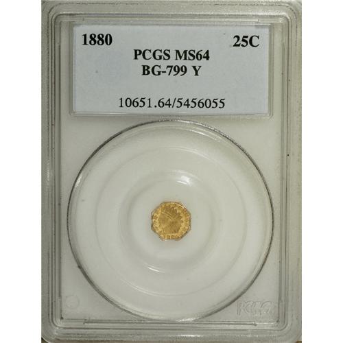 <B>1880 25C Indian Octagonal 25 Cents, BG-799Y, High R.4, MS64 PCGS.</B></I> PCGS Population (21/2). NGC Census: (2/1). (#10651)<BR><BR><b>Shipping:</b> Coins & Currency (<a target="_blank" href="http://www.heritageauctions.com/common/shipping.php">view shipping information</a>)