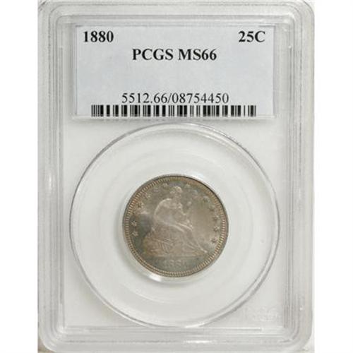 <B>1880 25C MS66 PCGS.</B></I> Ice-blue and amber-copper tinges grace each side of this stunning Premium Gem, one of the finest survivors of the small mintage of only 13,800 quarters in 1880. This sharply struck piece shows considerable cameo contrast, despite the deep toning. Population: 28 in 66, 8 finer (7/07).<BR><BR><B>Coin Engraver:</B> Christian Gobrecht<BR><BR><b>Shipping:</b> Coins & Currency (<a target="_blank" href="http://www.heritageauctions.com/common/shipping.php">view shipping information</a>\)