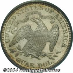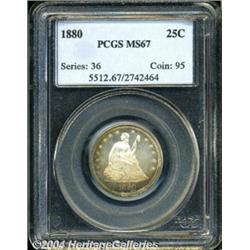 <B>1880<25C> MS67 PCGS.</B></I> Cameo prooflike surfaces and attractive, original border patina showing primarily on the obverse. The surfaces of this well preserved Superb Gem are virtually pristine, with almost no abrasions or other defects visible to the naked eye. The luster is extraordinary, with incredibly frosty fields and devices. A wonderful Seated Quarter that will appeal to true lovers of originality. Population: 6 in 67, 0 finer (3/04).<BR><I>From the JFS Collection.</B></I> <BR><BR><B>Important notice:</B> Heritage usually auctions material at the rate of 200-250 lots per hour. On some occasions eBay Live bid software or the Internet may not be able to keep up with the pace of the auction. We recommend placing a realistic absentee bid now as insurance to avoid disappointment. Occasionally the auctioneer may eliminate or reject an eBay Live bid, and the auctioneer may also reopen a lot after the close of the eBay live bidding (usually because we missed an audience bid), and may reject your bid even if it shows you as the winning bidder. By bidding via eBay Live, you agree that Heritage may award the lot to another bidder at its sole discretion under the circumstances described above or any other reasonable circumstances. Since eBay bids are not shown to us until we open the lot on the floor, we treat those bids just like floor bids. In most cases the floor responds before the eBay bid is presented to us, due to Internet lag time, so for consistency we have made it a policy that floor bids are always considered first over tie eBay live bids. Also please note that all Heritage lots purchased through eBay Live carry a 20% Buyer's Premium. Please make sure you read the Terms and Conditions before you bid. </span></font></tr></table></td></tr></table>