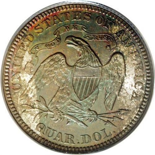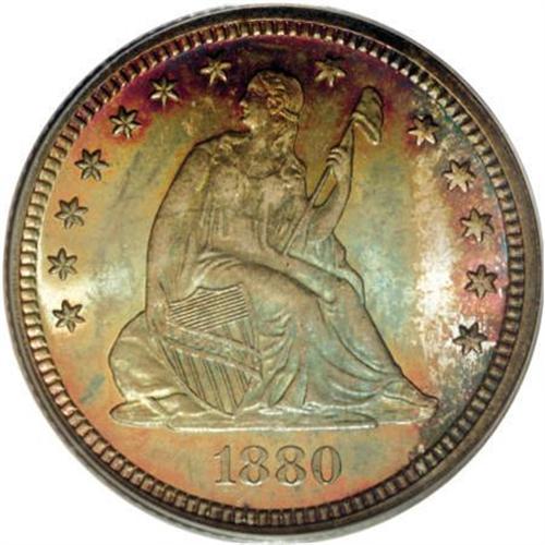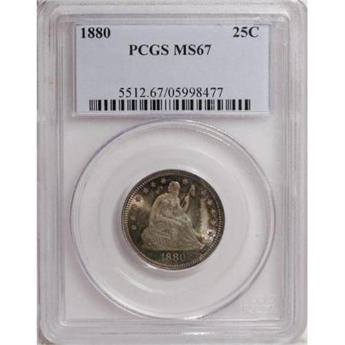 <B>1880 25C MS67 PCGS.</B></I> Type Two Reverse. This low-mintage (13,600 business strikes) Superb Gem quarter displays radiant luster and dramatic splashes of blue-green, purple, and gold-tan patina. The strike is intricate aside from a few of the upper right star centers. Near-pristine surfaces prevail on both sides. Population: 8 in 67, 0 finer (6/07).<BR><BR><B>Coin Engraver:</B> Christian Gobrecht<BR><BR><b>Shipping:</b> Coins & Currency (<a target="_blank" href="http://www.heritageauctions.com/common/shipping.php">view shipping information</a>\)