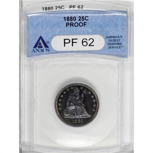 <B>1880 25C PR62 ANACS.</B></I> NGC Census: (15/239). PCGS Population (37/246). Mintage: 1,355. Numismedia Wsl. Price for NGC/PCGS coin in PR62: $390. (#5581)<BR><BR><B>Coin Engraver:</B> Christian Gobrecht<BR><BR><b>Shipping:</b> Coins & Currency (<a target="_blank" href="http://www.heritageauctions.com/common/shipping.php">view shipping information</a>)