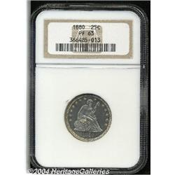 <B>1880<25C> PR63 NGC.</B></I> Type One Reverse. A flashy and exquisitely struck example that has noticeable frost on the devices, although the NGC insert does not provide a Cameo designation. The lightly toned fields possess a few faint hairlines. A low mintage date.<BR><I>From The Dr. Gary Hogg Collection.</B></I> <BR><BR><B>Important notice:</B> Heritage usually auctions material at the rate of 200-250 lots per hour. On some occasions eBay Live bid software or the Internet may not be able to keep up with the pace of the auction. We recommend placing a realistic absentee bid now as insurance to avoid disappointment. Occasionally the auctioneer may eliminate or reject an eBay Live bid, and the auctioneer may also reopen a lot after the close of the eBay live bidding (usually because we missed an audience bid), and may reject your bid even if it shows you as the winning bidder. By bidding via eBay Live, you agree that Heritage may award the lot to another bidder at its sole discretion under the circumstances described above or any other reasonable circumstances. Since eBay bids are not shown to us until we open the lot on the floor, we treat those bids just like floor bids. In most cases the floor responds before the eBay bid is presented to us, due to Internet lag time, so for consistency we have made it a policy that floor bids are always considered first over tie eBay live bids. Also please note that all Heritage lots purchased through eBay Live carry a 20% Buyer's Premium. Please make sure you read the Terms and Conditions before you bid.