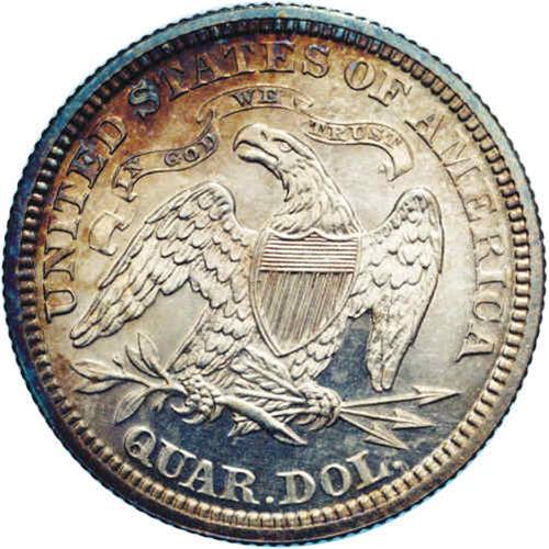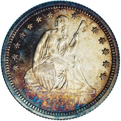 <B>1880<25C> PR64 Cameo NGC.</B></I> Type One Reverse. Lovingly toned in lemon and electric-blue colors, this needle-sharp Choice Proof possesses icy devices and only faintly hairlined fields. A radiant example of this scarce issue, limited to a combined proof and commercial production of 15,000 pieces. Portions of the drapery near the Y in LIBERTY are absent, as made from a lapped die.