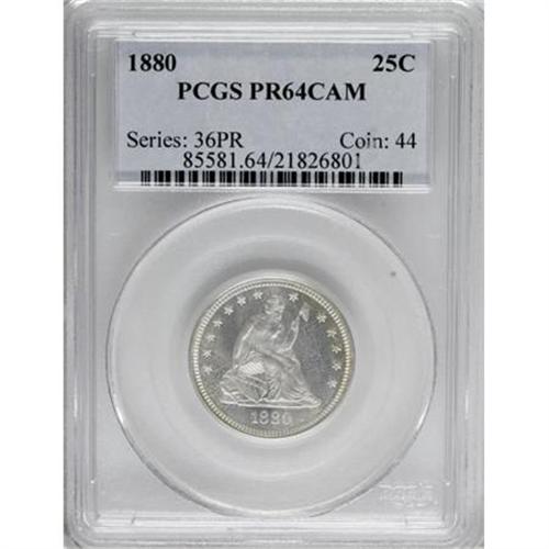 <B>1880 25C PR64 Cameo PCGS.</B></I> An intricately struck specimen with light milk-gray and apricot toning. Proofs and business strikes combined for fewer than 15,000 pieces. Population: 18 in 64 Cameo, 21 finer (6/07).<BR><BR><b>Shipping:</b> Coins & Currency (<a target="_blank" href="http://www.heritageauctions.com/common/shipping.php">view shipping information</a>\)