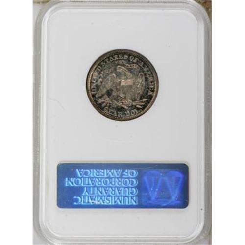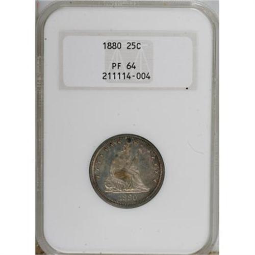 <B>1880 25C PR64 NGC.</B></I> Type One Reverse, diagnostic for proofs. This date has a combined proof and business strike mintage of fewer than 15,000 pieces. A well struck specimen with a peach and sky-blue obverse and a variegated sea-green and rose-gold reverse. Certified in a prior generation holder.<BR><BR><B>Coin Engraver:</B> Christian Gobrecht<BR><BR><b>Shipping:</b> Coins & Currency (<a target="_blank" href="http://www.heritageauctions.com/common/shipping.php">view shipping information</a>)