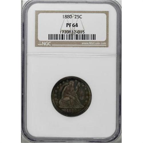 <B>1880 25C PR64 NGC.</B></I> Type One Reverse. Iridescent ruby-red, gold, sea-green, and mauve colors appear when the coin is rotated under a light. A well struck and carefully preserved near-Gem. Business strikes and proofs had a combined production of less than 15,000 pieces.<BR><BR><B>Coin Engraver:</B> Christian Gobrecht<BR><BR><b>Shipping:</b> Coins & Currency (<a target="_blank" href="http://www.heritageauctions.com/common/shipping.php">view shipping information</a>)