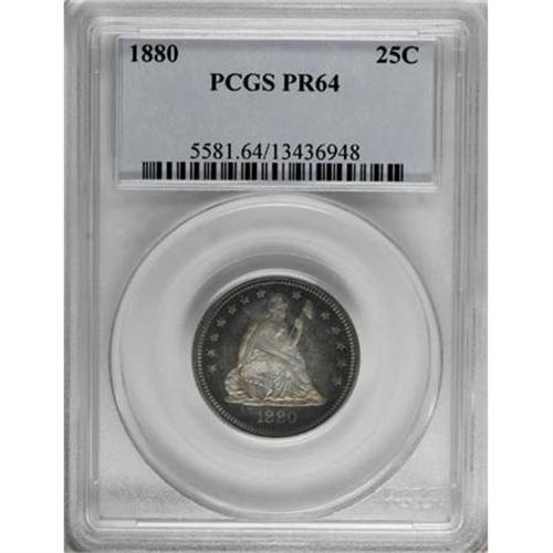 <B>1880 25C PR64 PCGS.</B></I> An impressive cameo proof, although it carries no designation. Both sides have bright silver color at the centers, surrounded by splendid sea-green toning.<BR><BR><B>Coin Engraver:</B> Christian Gobrecht<BR><BR><b>Shipping:</b> Coins & Currency (<a target="_blank" href="http://www.heritageauctions.com/common/shipping.php">view shipping information</a>)