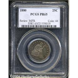 <B>1880<25C> PR65 PCGS.</B></I> Both sides reveal moderately deep gold-brown toning, with the reverse showing medium bluish coloration in the rim areas. All of the design elements are sharply brought up, and the pristine surfaces are virtually devoid of any significant marks. A few wispy, unimportant hairlines in the field appear under magnification, but none are at all serious. This is a very pleasing cameo proof Seated quarter. Population: 41 in 65, 50 finer (3/04). <BR><BR><B>Important notice:</B> Heritage usually auctions material at the rate of 200-250 lots per hour. On some occasions eBay Live bid software or the Internet may not be able to keep up with the pace of the auction. We recommend placing a realistic absentee bid now as insurance to avoid disappointment. Occasionally the auctioneer may eliminate or reject an eBay Live bid, and the auctioneer may also reopen a lot after the close of the eBay live bidding (usually because we missed an audience bid), and may reject your bid even if it shows you as the winning bidder. By bidding via eBay Live, you agree that Heritage may award the lot to another bidder at its sole discretion under the circumstances described above or any other reasonable circumstances. Since eBay bids are not shown to us until we open the lot on the floor, we treat those bids just like floor bids. In most cases the floor responds before the eBay bid is presented to us, due to Internet lag time, so for consistency we have made it a policy that floor bids are always considered first over tie eBay live bids. Also please note that all Heritage lots purchased through eBay Live carry a 20% Buyer's Premium. Please make sure you read the Terms and Conditions before you bid.