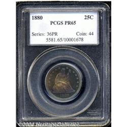 <B>1880<25C> PR65 PCGS.</B></I> Deeply toned on the obverse by iridescent shades of electric-blue, purple-red, and deep amber. The reverse is light-gray, with a slender band of golden-brown and electric-blue rim toning. Unmarked and well struck throughout, with delightfully reflective fields. Unquestionably original, this noteworthy Gem should have special appeal for the lover of rich patina.<BR><I>From the JFS Collection.</B></I> <BR><BR><B>Important notice:</B> Heritage usually auctions material at the rate of 200-250 lots per hour. On some occasions eBay Live bid software or the Internet may not be able to keep up with the pace of the auction. We recommend placing a realistic absentee bid now as insurance to avoid disappointment. Occasionally the auctioneer may eliminate or reject an eBay Live bid, and the auctioneer may also reopen a lot after the close of the eBay live bidding (usually because we missed an audience bid), and may reject your bid even if it shows you as the winning bidder. By bidding via eBay Live, you agree that Heritage may award the lot to another bidder at its sole discretion under the circumstances described above or any other reasonable circumstances. Since eBay bids are not shown to us until we open the lot on the floor, we treat those bids just like floor bids. In most cases the floor responds before the eBay bid is presented to us, due to Internet lag time, so for consistency we have made it a policy that floor bids are always considered first over tie eBay live bids. Also please note that all Heritage lots purchased through eBay Live carry a 20% Buyer's Premium. Please make sure you read the Terms and Conditions before you bid. </span></font></tr></table></td></tr></table>