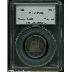<table><tr><td><TABLE cellSpacing=0 cellPadding=0 width="100%" bgColor=#000000 border=0><TBODY> <TR><TD width="100%"><TABLE cellSpacing=1 cellPadding=3 width="100%" border=0><TBODY><TR><TD width="100%" bgColor=#79735c><FONT face=arial color=#ffffff size=3><B>Description</B> </FONT></TD></TR><TR><TD width="100%" bgColor=#ffffff><FONT face=arial size=2><B>1880 25C PR66 PCGS.</B></I> Only 14,955 quarters were struck in total in 1880, of which 1,355 pieces were proofs. This is a richly patinated example that shows blue and sea-green toning on the obverse with pale yellow and rose coloration on the reverse and significant original underlying brilliance. A few light specks of color are scattered over the reverse. A high quality proof striking. </FONT></TD></TR></TBODY></TABLE></TD></TR></TBODY></TABLE><BR><A name=PricesRealized></A><TABLE cellSpacing=0 cellPadding=0 width="100%" bgColor=#000000 border=0><TBODY><TR><TD width="100%"><TABLE cellSpacing=1 cellPadding=3 width="100%" border=0><TBODY><TR><TD width="100%" bgColor=#79735c><A name=PR><FONT face=arial color=#ffffff size=3><B>Previous Prices from Heritage Auctions</B> </FONT></A></TD></TR><TR><TD bgColor=#f6f6ed><TABLE cellSpacing=0 cellPadding=0 width="100%" border=1><TBODY><TR><TD align=middle width="33%"><B>Date</B></TD><TD align=middle width="33%"><B>Service</B></TD><TD align=middle width="33%"><B>Price</B></TD></TR><TR bgColor=whitesmoke><TD width="33%"><B>03/01/2003</B></TD><TD width="33%">PCGS</TD><TD width="33%">$2,011.35</TD></TR><TR bgColor=whitesmoke><TD width="33%"><B>06/08/2002</B></TD><TD width="33%">PCGS</TD><TD width="33%">$1,955.00</TD></TR><TR bgColor=whitesmoke><TD width="33%"><B>08/08/2001</B></TD><TD width="33%">NGC</TD><TD width="33%">$2,070.00</TD></TR><TR bgColor=whitesmoke><TD width="33%"><B>01/05/2001</B></TD><TD width="33%">PCGS</TD><TD width="33%">$4,312.50</TD></TR><TR bgColor=whitesmoke><TD width="33%"><B>08/07/2000</B></TD><TD width="33%">PCGS</TD><TD width="33%">$2,530.00</TD></TR><TR bgColor=whitesmoke><TD width="33%"><B>02/11/2000</B></TD><TD width="33%">NGC</TD><TD width="33%">$2,760.00</TD></TR><TR bgColor=whitesmoke><TD width="33%"><B>08/17/1996</B></TD><TD width="33%">NGC</TD><TD width="33%">$3,850.00</TD></TR><TR bgColor=whitesmoke><TD width="33%"><B>08/19/1995</B></TD><TD width="33%">PCGS</TD><TD width="33%">$2,860.00</TD></TR><TR bgColor=whitesmoke><TD width="33%"><B>06/22/2000</B></TD><TD width="33%">PCGS</TD><TD width="33%">$3,048.00</TD></TR><TR bgColor=whitesmoke><TD width="33%"><B>03/21/2002</B></TD><TD width="33%">PCGS</TD><TD width="33%">$2,760.00</TD></TR><TR bgColor=whitesmoke><TD width="33%"><B>05/01/2001</B></TD><TD width="33%">PCGS</TD><TD width="33%">$2,990.00</TD></TR><TR bgColor=whitesmoke><TD width="33%"><B>08/01/1999</B></TD><TD width="33%">PCGS</TD><TD width="33%">$4,370.00</TD></TR><TR bgColor=whitesmoke><TD width="33%"><B>03/01/2000</B></TD><TD width="33%">PCGS</TD><TD width="33%">$2,530.00</TD></TR></TBODY></TABLE></TD></TR><TR><TD bgColor=#ffffff><FONT face=arial size=1 ?>PLEASE NOTE: All prices realized reflect the final hammer price PLUS the buyer's premium in auctions that charge a buyer's premium. Each item has a notation at the top of the listing indicating whether that lot included a buyer's premium. Example: A item that sells with a final hammer price of $100 and a 20% buyer's premium will display with a price realized of $120. All information listed is intended to be as accurate as possible, but errors are possible. Please use this guide carefully and inform us of any inaccuracies. </FONT></TD></TR></TBODY></TABLE></TD></TR></TBODY></TABLE><BR><TABLE cellSpacing=0 cellPadding=0 width="100%" bgColor=#000000 border=0><TBODY><TR><TD width="100%"><TABLE cellSpacing=1 cellPadding=3 width="100%" border=0><TBODY><TR><TD width="100%" bgColor=#79735c colSpan=6><FONT face=arial color=#ffffff size=3><B>Price Guide*</B> </FONT></TD></TR><TR bgColor=#f6f6ed><TD align=middle><B>Grade</B> </TD><TD align=middle><B>Coin World<BR>(Trends)</B> </TD><TD align=middle><B>Numismedia<BR>Retail</B> </TD><TD align=middle><B>Numismedia<BR>Wholesale</B> </TD><TD align=middle><B>Coin<BR>Universe</B> </TD><TD align=middle><B>Heritage<BR>Value Index</B> </TD></TR><TR bgColor=#ffffff><TD align=middle>65</TD><TD align=right>---</TD><TD align=right>---</TD><TD align=right>$1,375.00</TD><TD align=right>$2,200.00</TD><TD align=right>$1,373.00</TD></TR><TR style="FONT-WEIGHT: bold" bgColor=#cccfdd><TD align=middle>66</TD><TD align=right>---</TD><TD align=right>---</TD><TD align=right>$2,425.00</TD><TD align=right>$3,750.00</TD><TD align=right>$2,337.50</TD></TR><TR bgColor=#ffffff><TD align=middle>67</TD><TD align=right>---</TD><TD align=right>---</TD><TD align=right>$4,850.00</TD><TD align=right>$6,600.00</TD><TD align=right>$5,660.00</TD></TR><TR bgColor=#ffffff><TD colSpan=6><FONT size=1>*All information listed is intended to be as accurate as possible, but errors are possible. No item may be returned or refused based on this information which is provided as a service to our customers. You should contact each pricing source directly to determine the accuracy of this information. </FONT></TD></TR></TBODY></TABLE></TD></TR></TBODY></TABLE><BR><TABLE cellSpacing=0 cellPadding=0 width="100%" bgColor=#000000 border=0><TBODY><TR><TD width="100%"><TABLE cellSpacing=1 cellPadding=3 width="100%" border=0><TBODY><TR><TD width="100%" bgColor=#79735c><FONT face=arial color=#ffffff size=3><B>Population Guide</B> </FONT></TD></TR><TR bgColor=#ffffff><TD align=middle><!-- Begin Output of Population Grid--><TABLE cellSpacing=0 cellPadding=0 width="100%" border=0><TBODY><TR><TD vAlign=center><TABLE cellSpacing=0 width="100%" border=1 cellsadding="3"><TBODY><TR><TD vAlign=center><TABLE cellSpacing=0 cellPadding=3 width="100%" border=1><TBODY><TR><TD vAlign=center align=middle bgColor=#f0f1e8 colSpan=2 <CENTER><FONT face=Arial size=2><B>PCGS Pop </B></FONT><CENTER></CENTER></TD><TD vAlign=center align=middle bgColor=#f0f