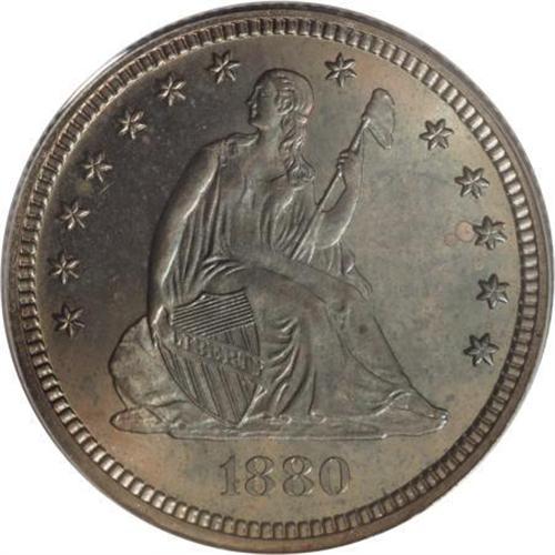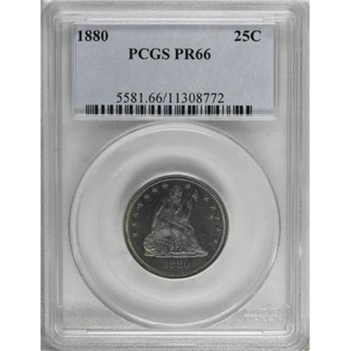 <B>1880 25C PR66 PCGS.</B></I> Type One Reverse. This is an extraordinary proof with excellent cameo contrast, although it is not designated as a cameo proof due to the thick sea-green, gold, and iridescent toning on both sides. All design features are boldly detailed. Population: 34 in 66, 15 finer (8/07).<BR><BR><B>Coin Engraver:</B> Christian Gobrecht<BR><BR><b>Shipping:</b> Coins & Currency (<a target="_blank" href="http://www.heritageauctions.com/common/shipping.php">view shipping information</a>)