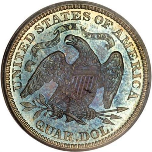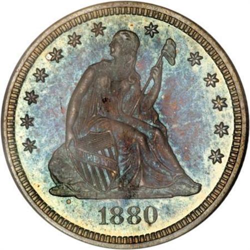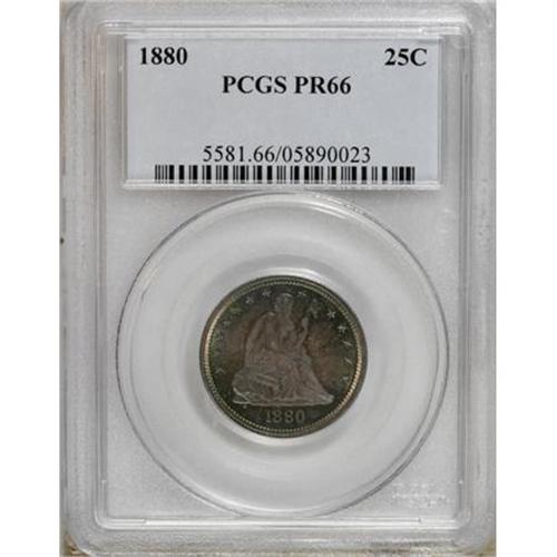 <B>1880 25C PR66 PCGS.</B></I> Type One Reverse. The overall preservation of this sharply struck exemplar is impressive, but the most elegant attribute of this quarter is its rich patina. Both sides show elegant sea-green patina at the watery peripheries that fades into sapphire and amethyst in the centers. A captivating survivor from this issue of 1,355 pieces. Population: 36 in 66, 15 finer (12/07).<BR><BR><B>Coin Engraver:</B> Christian Gobrecht<BR><BR><b>Shipping:</b> Coins & Currency (<a target="_blank" href="http://www.heritageauctions.com/common/shipping.php">view shipping information</a>)
