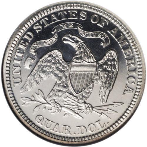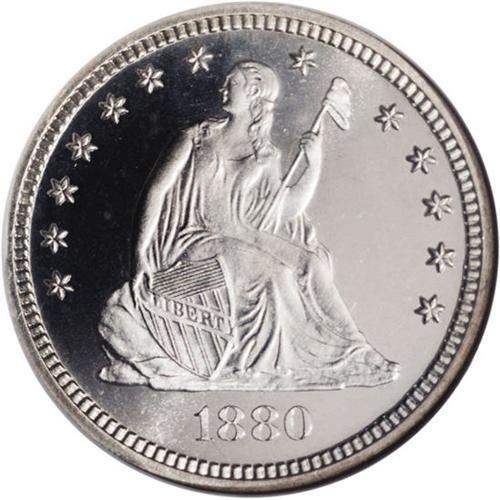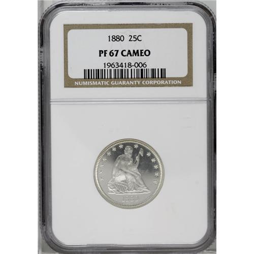 <B>1880<25C> PR67 Cameo NGC.</B></I> Type One Reverse. The Mint reportedly made 1,355 proofs in 1880, and more than 500 coins have been certified by NGC and PCGS. Fewer than 100 pieces, however, have been assigned the Cameo designation. The Superb Gem Cameo offered in this lot displays essentially untoned surfaces that exhibit sharply struck, frosted design elements highlighted by deeply mirrored fields. Nearly pristine surfaces are virtually blemish free. Fantastic overall eye appeal. Census: 14 in 67, 6 finer (2/06).