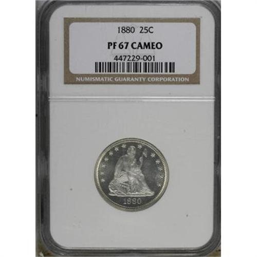 <B>1880 25C PR67 Cameo NGC.</B></I> Type One Reverse. This is a magnificent, completely untoned example that has heavily frosted devices set against deeply mirrored fields that go "black" as the coin is angled away from the viewer. A well directed strike imparts crisp definition to the design elements, further enhancing the coin's outstanding eye appeal. Essentially flawless surfaces. Census: 13 in 67 Cameo, 6 finer (10/07).<BR><BR><b>Shipping:</b> Coins & Currency (<a target="_blank" href="http://www.heritageauctions.com/common/shipping.php">view shipping information</a>)