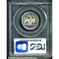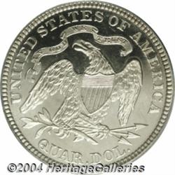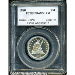<B>1880<25C> PR67 Deep Cameo PCGS.</B></I> It's hard to imagine a more splendid example of a Superb Gem Proof Seated Liberty quarter than this one. The frosty devices offer a fantastic contrast with the deeply mirrored fields. Just a touch of light golden-tan toning occurs in the central part of the obverse main device, and faint speckles of milky coloration are found in the fields. The design elements are exceptionally well struck, and the impeccably preserved surfaces are virtually devoid of any significant blemishes. Population: 2 in 67, 0 finer (3/04).<BR><I>From the JFS Collection.</B></I> <BR><BR><B>Important notice:</B> Heritage usually auctions material at the rate of 200-250 lots per hour. On some occasions eBay Live bid software or the Internet may not be able to keep up with the pace of the auction. We recommend placing a realistic absentee bid now as insurance to avoid disappointment. Occasionally the auctioneer may eliminate or reject an eBay Live bid, and the auctioneer may also reopen a lot after the close of the eBay live bidding (usually because we missed an audience bid), and may reject your bid even if it shows you as the winning bidder. By bidding via eBay Live, you agree that Heritage may award the lot to another bidder at its sole discretion under the circumstances described above or any other reasonable circumstances. Since eBay bids are not shown to us until we open the lot on the floor, we treat those bids just like floor bids. In most cases the floor responds before the eBay bid is presented to us, due to Internet lag time, so for consistency we have made it a policy that floor bids are always considered first over tie eBay live bids. Also please note that all Heritage lots purchased through eBay Live carry a 20% Buyer's Premium. Please make sure you read the Terms and Conditions before you bid. </span></font></tr></table></td></tr></table>