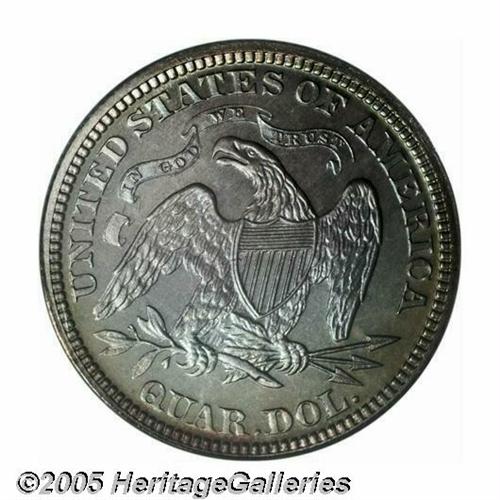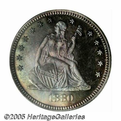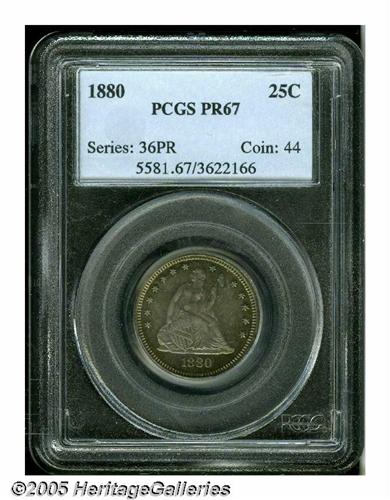 <B>1880<25C> PR67 PCGS.</B></I> Placid mirrors and well frosted devices rest beneath splendid layers of lilac, golden-orange, and plum toning. The closer one looks at this nicely toned Superb proof, the better it looks. Population: 12 in 67, 2 finer (5/05).
