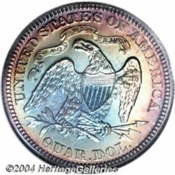 <table><tr><td><table><tr><td>1880 25C PR68 NGC. Even though William Barber redesigned the reverse hub of the Seated quarter in 1875 the Mint did not discard all of the dies sunk from the old reverse hub. At least one of these dies was in use as late as 1880, and it is identifiable by a cut over the left border of the reverse shield. This coin was struck from that die. Only 1,355 proofs were produced out of a total mintage of 14,955 pieces, making the 1880 a very desirable and seldom seen coin in high grades. This is the finest example we have handled since the Kaufman specimen in the 2003 FUN Sale. As one would expect from an MS68, this piece derives much of its grade not merely from the technical preservation of the surfaces but also from the array of multicolored toning that is splashed over each side. Deep blue, rose, violet, and pale citrine are seen throughout and these colors are backlighted by the intensely bright mirrors from the proof fields. Sure to realize more than the $8,050 the Kaufman coin brought. <BR><BR><B>Important notice:</B> Heritage usually auctions material at the rate of 200-250 lots per hour. On some occasions eBay Live bid software or the Internet may not be able to keep up with the pace of the auction. We recommend placing a realistic absentee bid now as insurance to avoid disappointment. Occasionally the auctioneer may eliminate or reject an eBay Live bid, and the auctioneer may also reopen a lot after the close of the eBay live bidding (usually because we missed an audience bid), and may reject your bid even if it shows you as the winning bidder. By bidding via eBay Live, you agree that Heritage may award the lot to another bidder at its sole discretion under the circumstances described above or any other reasonable circumstances. Since eBay bids are not shown to us until we open the lot on the floor, we treat those bids just like floor bids. In most cases the floor responds before the eBay bid is presented to us, due to Internet lag time, so for consistency we have made it a policy that floor bids are always considered first over tie eBay live bids. Also please note that all Heritage lots purchased through eBay Live carry a 20% Buyer's Premium. Please make sure you read the Terms and Conditions before you bid. <BR><BR><B>IMPORTANT ANNOUNCEMENT ABOUT RESERVES:</B> Heritage now divulges all reserves on its web site 7 days before every auction. If you want to know whether the reserve on this lot has been met, and if not, what the reserve amount is, please visit this lot page on the HeritageCoin.com web site, or email: bid@HeritageGalleries.com </span></font></td></tr></table></td></tr></table>