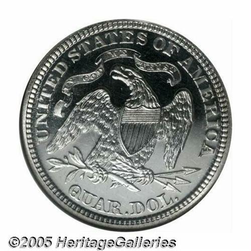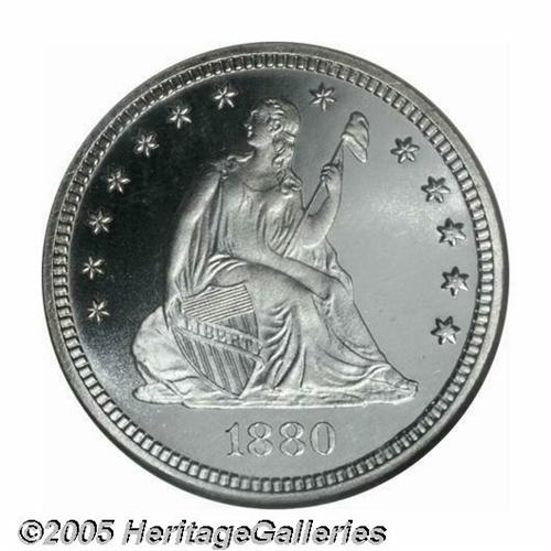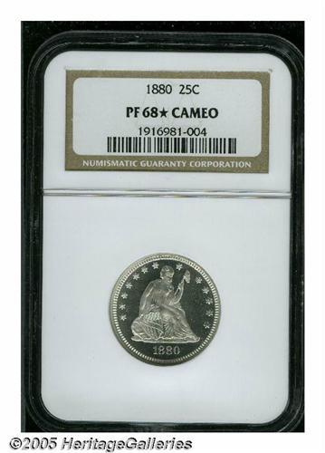 <B>1880<25C> PR68 <S Cameo NGC.</B></I> Obvious white on black contrast challenges the Ultra Cameo designation. A gorgeous, razor-sharp, and fully brilliant Superb Gem, unquestionably among the finest examples of the date. The quality is worthy of a trophy winning Registry holding. Proofs and business strikes combined for less than 15,000 pieces, since the mints were burdened with heavy Morgan Dollar production. Population: 1 in 68 <S Cameo, 1 finer as PR69 Cameo with a star designation (4/05).