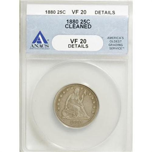 <B>1880 25C --Cleaned--ANACS. VF20 Details.</B></I> NGC Census: (0/112). PCGS Population (2/178). Mintage: 13,600. Numismedia Wsl. Price for NGC/PCGS coin in VF20: $240. (#5512)<BR><BR><B>Coin Engraver:</B> Christian Gobrecht<BR><BR><b>Shipping:</b> Coins & Currency (<a target="_blank" href="http://www.heritageauctions.com/common/shipping.php">view shipping information</a>)
